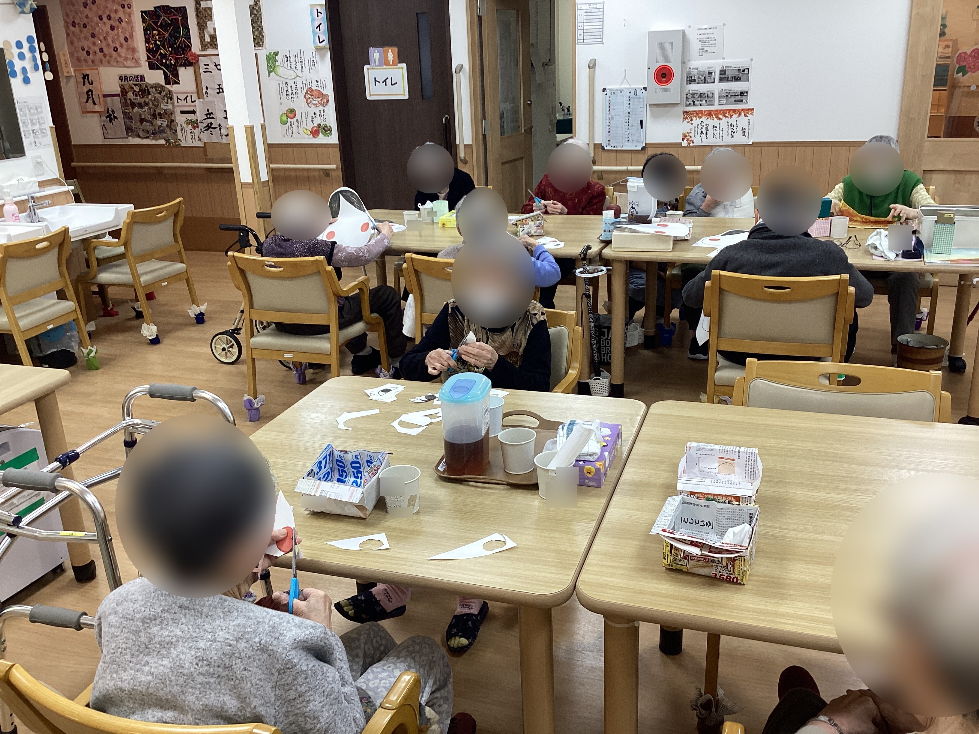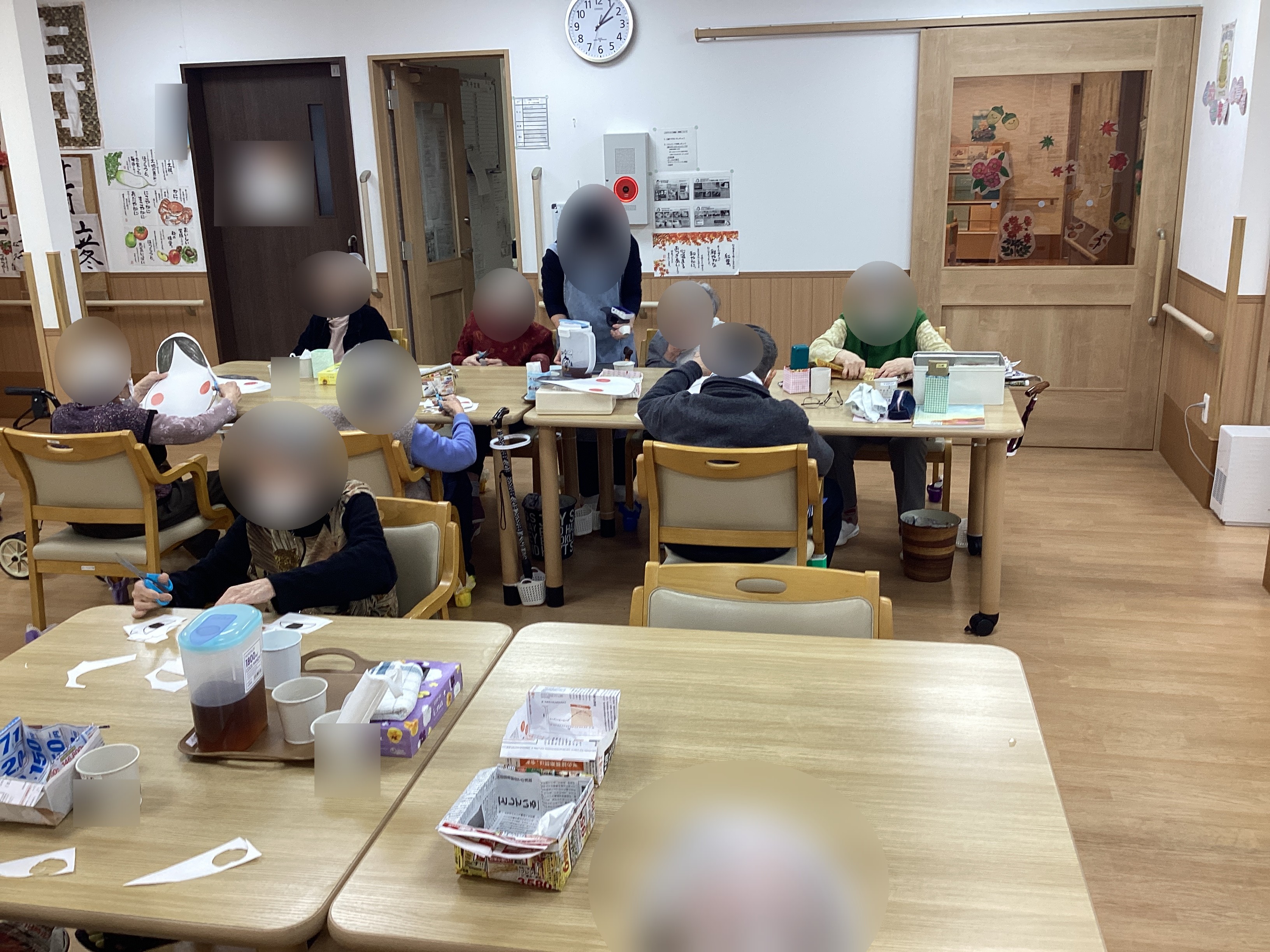 職員自作の福笑いをおひとりずつお配りさせていただき、