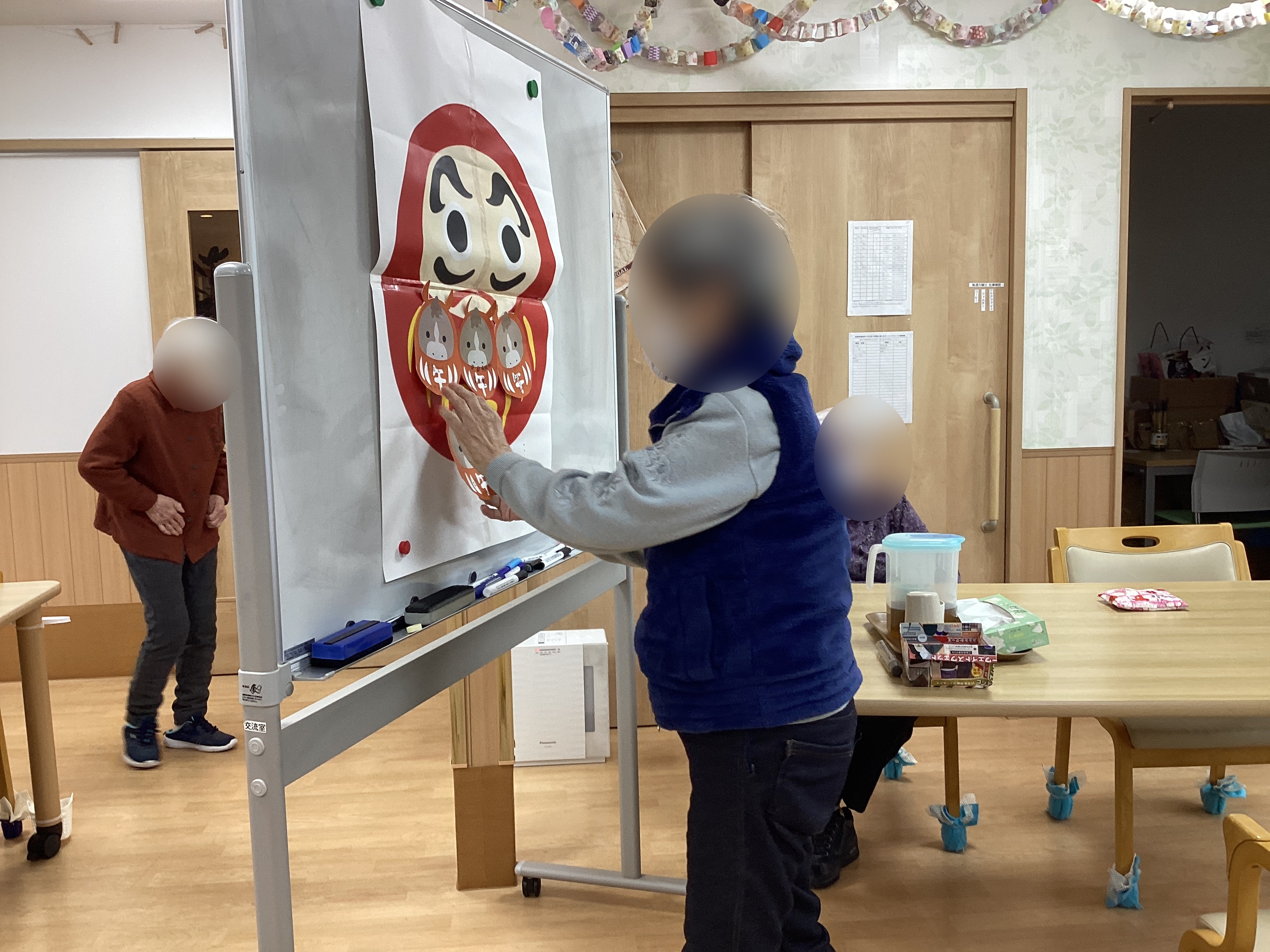 午後からは、干支だるまに新年の目標を書いて大だるまに貼っていただいたり、
