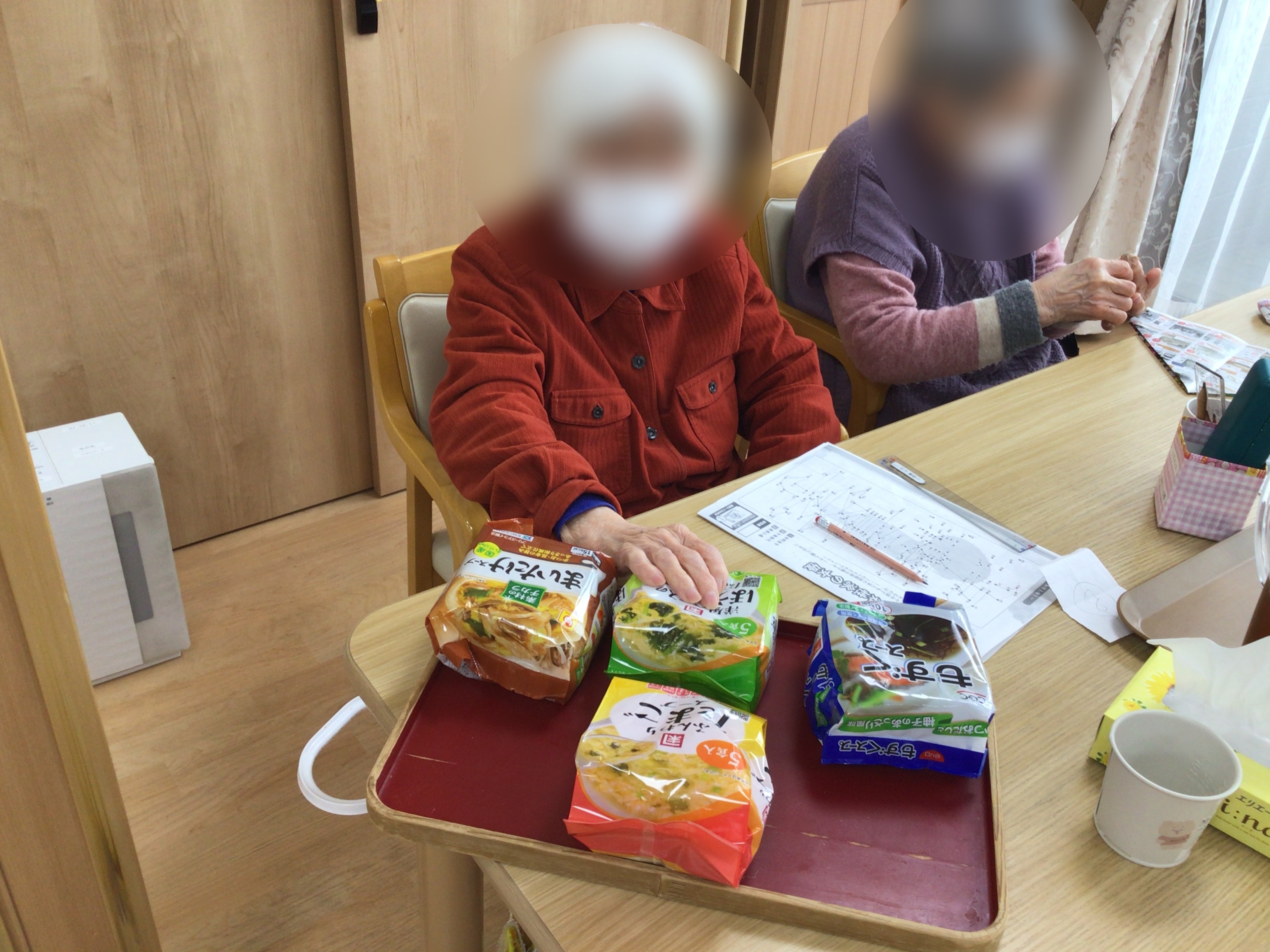 今日の昼食メニューは、麦ご飯、福袋煮、オクラとなめこのおかか和え、