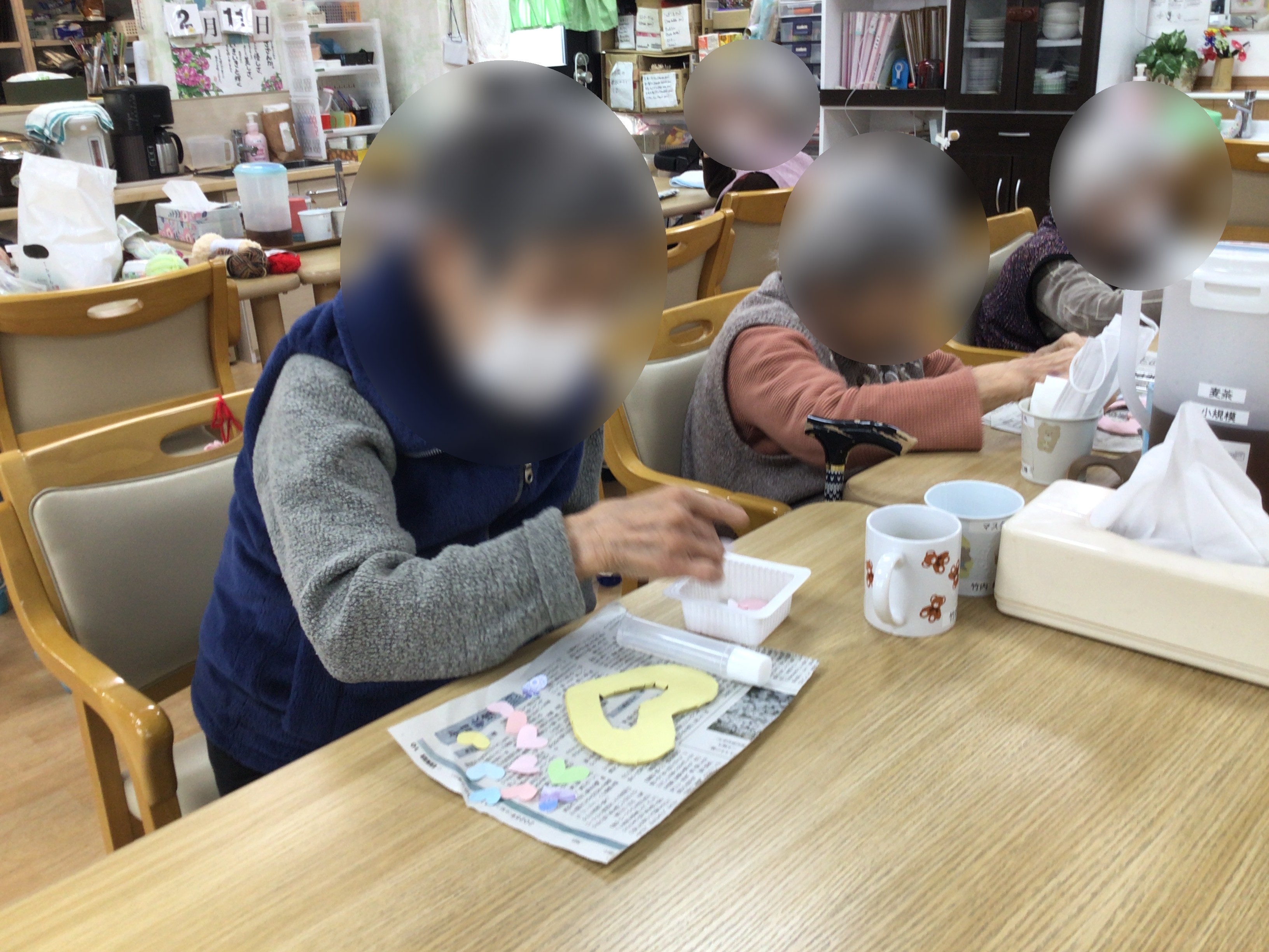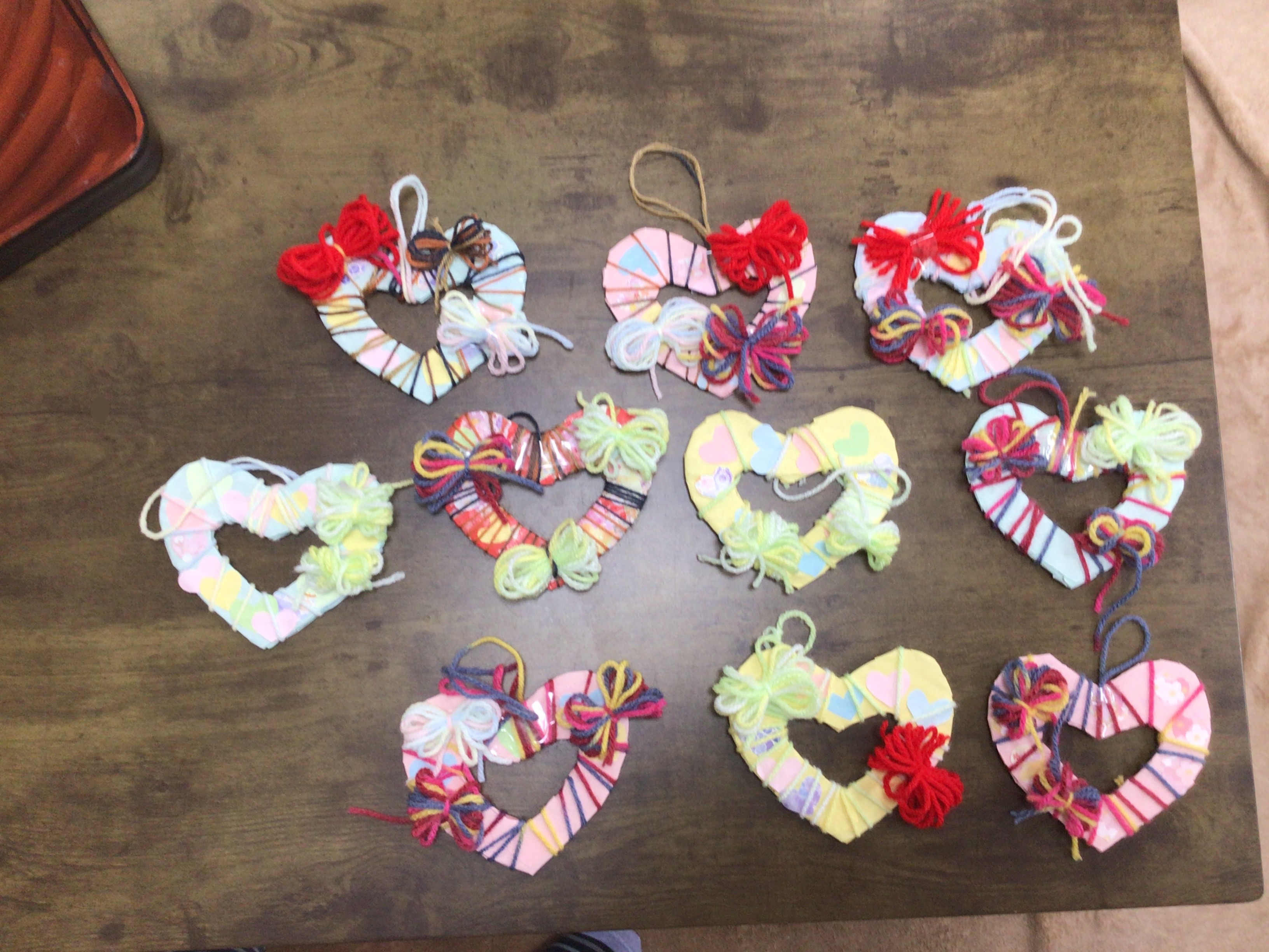今日のレクリエーションは、毛糸を使ったハート飾りの制作です