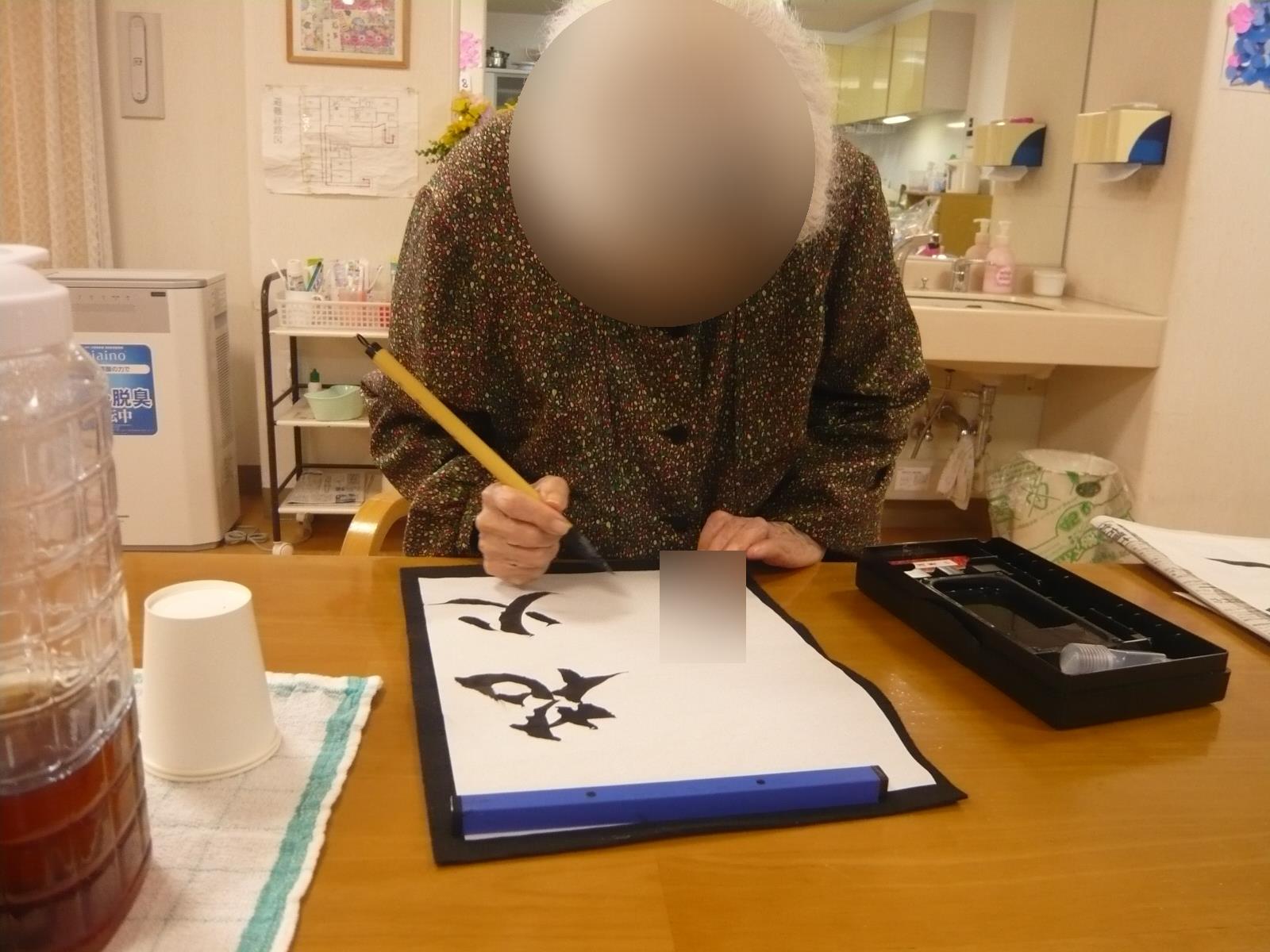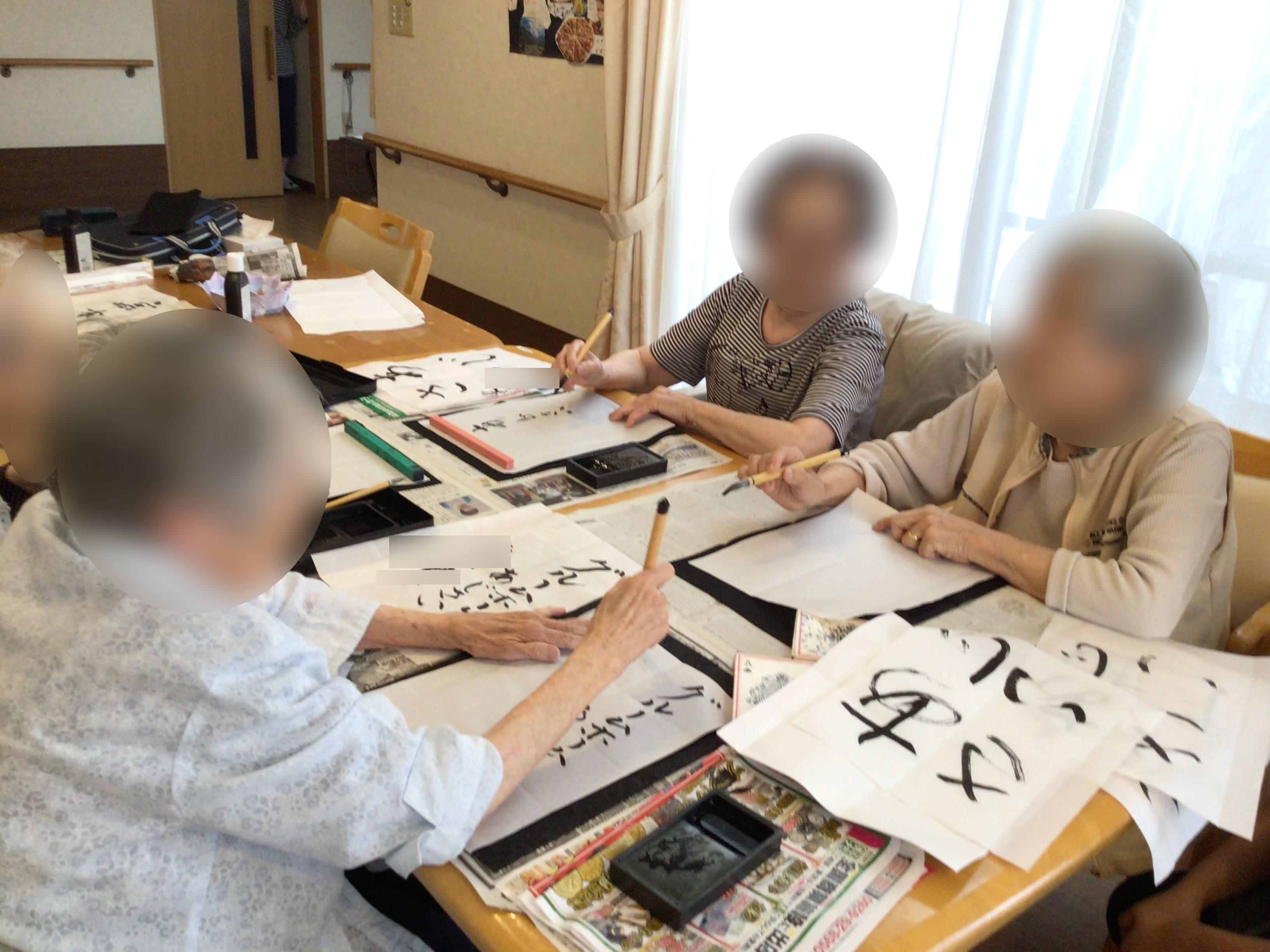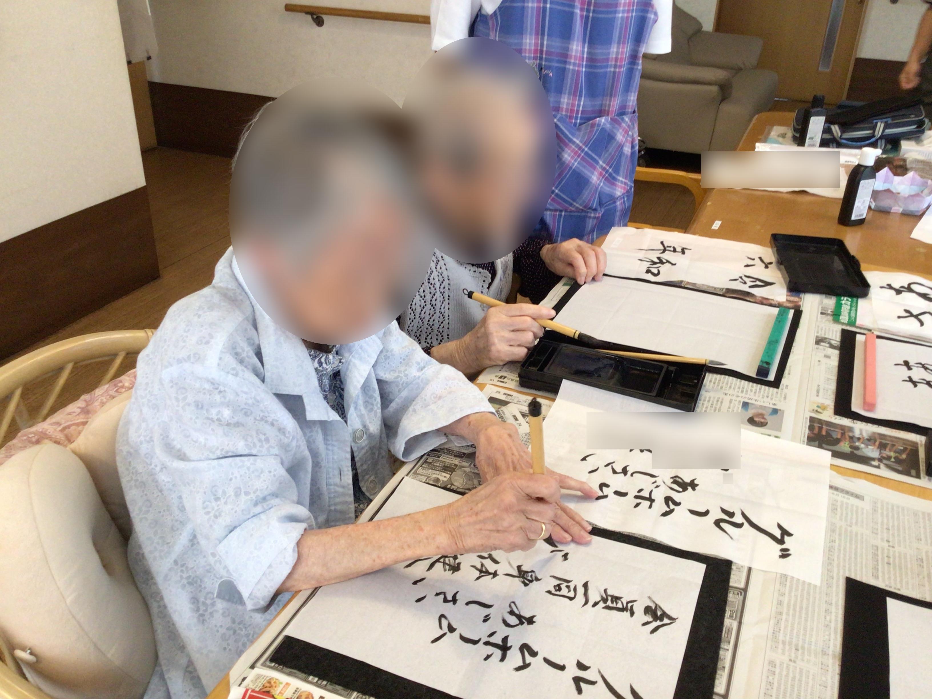 1階と2階のご利用者様が一緒にテーブルを囲み、お話しながら習字を行いました