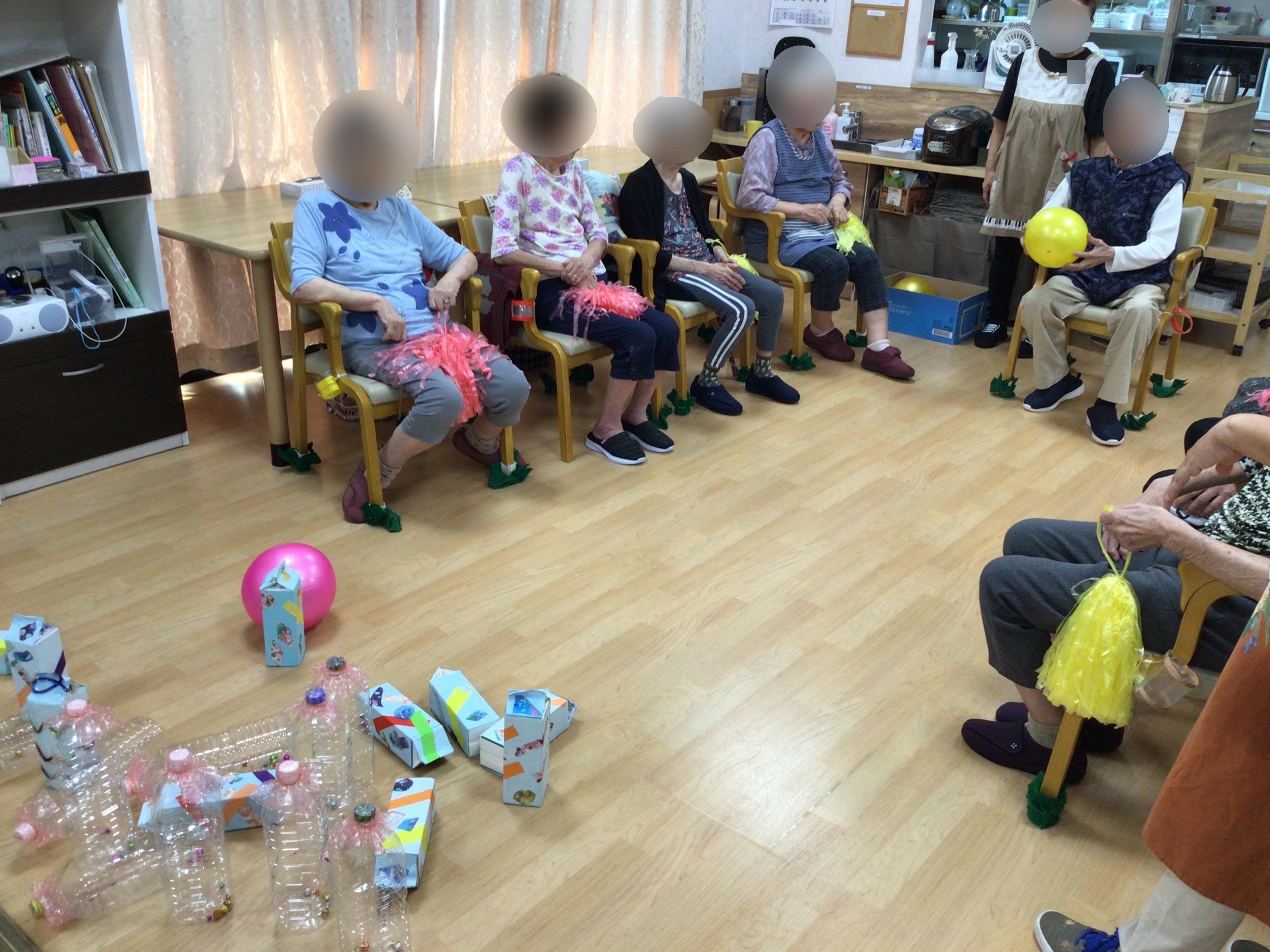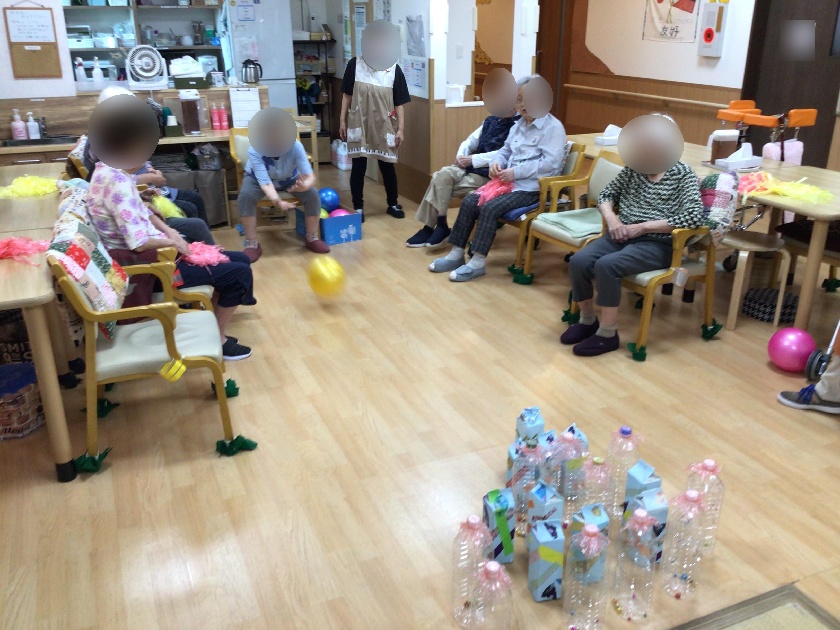 ボウリングのピンをペットボトルで代用し、座っても出来るボウリングを行いました