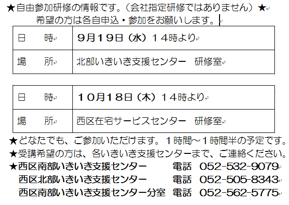 自主研修ですので、ご希望の方はご自分で各いきいき支援センターへ申し込みを行い参加してください。