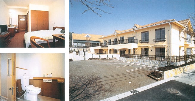広い居室(専有面積22㎡)、各室便所、洗面化粧台、机、ソファー、イス、クローゼット、テレビ台、広いガーデンとテラス、医療の支援体制
